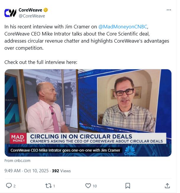 The following communication was posted by CoreWeave, Inc. on its X account on October 10, 2025 in relation to an interview with Michael Intrator, Chief Executive Officer of CoreWeave, on October 8, 2025 in connection with CoreWeave's proposed acquisition of Core Scientific, Inc. and other acquisition activities.