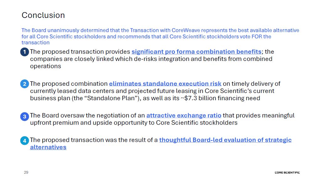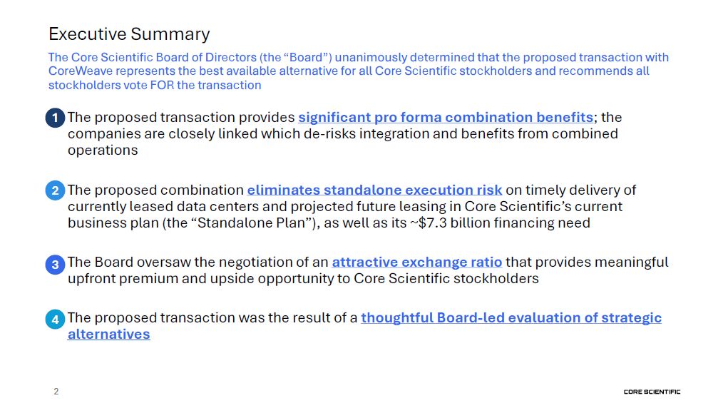 unanimously determined that the proposed transaction with CoreWeave represents the best available alternative for all Core Scientific stockholders and recommends all stockholders vote FOR the transaction 1 The proposed transaction provides