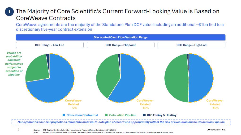 information based on Moelis Fairness Opinion delivered to Core Scientific’s Board of Directors on 07/07/2025; Market Data as of 07/03/2025 DCF Range – Low End DCF Range – Midpoint DCF Range – High End Values are probability- adjusted;