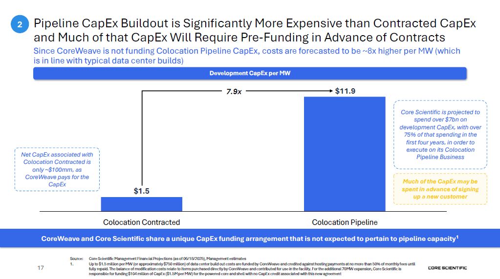 agreement Since CoreWeave is not funding Colocation Pipeline CapEx, costs are forecasted to be ~8x higher per MW (which is in line with typical data center builds) Development CapEx per MW Core Scientific is projected to spend over $7bn