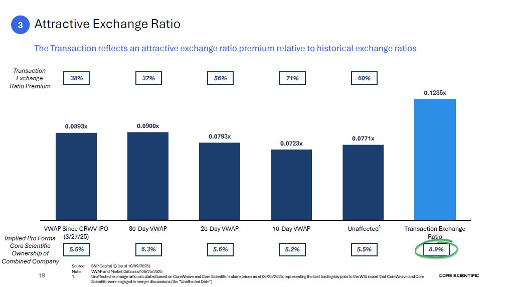 as of 06/25/2025 1. Unaffected exchange ratio calculated based on CoreWeave and Core Scientific’s share prices as of 06/25/2025, representing the last trading day prior to the WSJ report that CoreWeave and Core Scientific were engaged in
