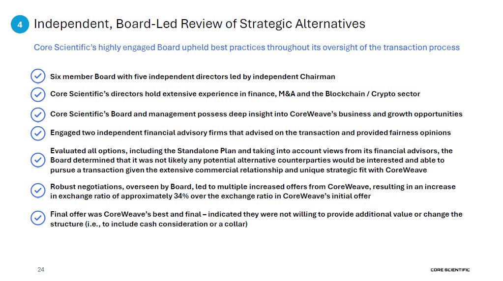 independent Board provided direct oversight of negotiations with CoreWeave and met numerous times throughout the process, which led to increased offers from CoreWeave Thoughtfully considered alternatives, including the tradeoffs between this