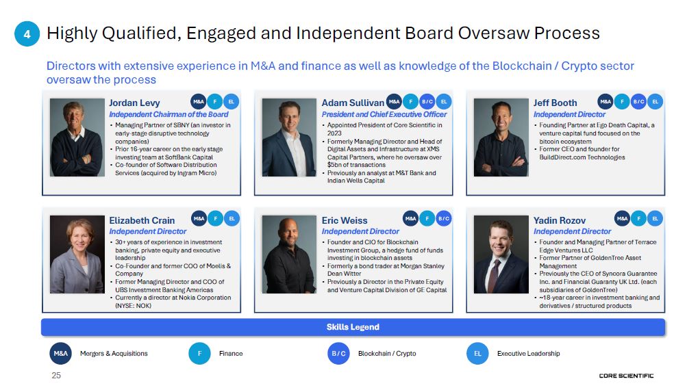 oversight of the transaction process Six member Board with five independent directors led by independent Chairman Core Scientific’s directors hold extensive experience in finance, M&A and the Blockchain / Crypto sector Core