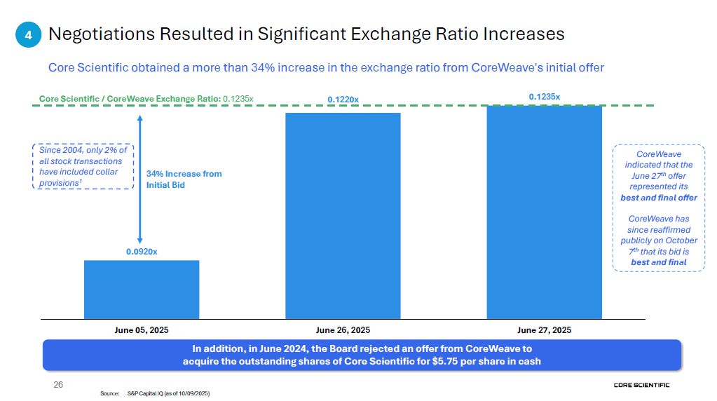 October 7th that its bid is best and final 26 Core Scientific obtained a more than 34% increase in the exchange ratio from CoreWeave's initial offer 4 June 26, 2025 June 27, 2025 In addition, in June 2024, the Board rejected an offer