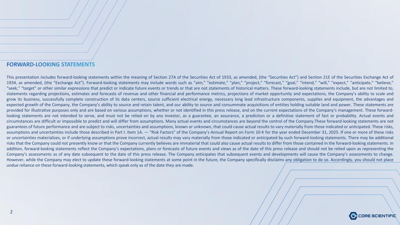 FORWARD-LOOKING STATEMENTS This presentation includes forward-looking statements within the meaning of Section 27A of the Securities Act of 1933, as amended, (the “Securities Act”) and Section 21E of the Securities Exchange Act of 1934, as amended, (the “Exchange Act”). Forward-looking statements may include words such as “aim,” “estimate,” “plan,” “project,” “forecast,” “goal,” “intend,” “will,” “expect,” “anticipate,” “believe,” “seek,” “target” or other similar expressions that predict or indicate future events or trends or that are not statements of historical matters. These forward-looking statements include, but are not limited to, statements regarding projections, estimates and forecasts of revenue and other financial and performance metrics, projections of market opportunity and expectations, the Company’s ability to scale and grow its business, successfully complete construction of its data centers, source sufficient electrical energy, necessary long lead infrastructure components, supplies and equipment, the advantages and expected growth of the Company, the Company’s ability to source and retain talent, and our ability to source and consummate acquisitions of entities holding suitable land and power. These statements are provided for illustrative purposes only and are based on various assumptions, whether or not identified in this press release, and on the current expectations of the Company’s management. These forward- looking statements are not intended to serve, and must not be relied on by any investor, as a guarantee, an assurance, a prediction or a definitive statement of fact or probability. Actual events and circumstances are difficult or impossible to predict and will differ from assumptions. Many actual events and circumstances are beyond the control of the Company.These forward-looking statements are not guarantees of future performance and are subject to risks, uncertainties and assumptions, known or unknown, that could cause actual results to vary materially from those indicated or anticipated. These risks, assumptions and uncertainties include those described in Part I. Item 1A. — “Risk Factors” of the Company’s Annual Report on Form 10-K for the year ended December 31, 2025. If one or more of these risks or uncertainties materializes, or if underlying assumptions prove incorrect, actual results may vary materially from those indicated or anticipated by such forward-looking statements. There may be additional risks that the Company could not presently know or that the Company currently believes are immaterial that could also cause actual results to differ from those contained in the forward-looking statements. In addition, forward-looking statements reflect the Company’s expectations, plans or forecasts of future events and views as of the date of this press release and should not be relied upon as representing the Company’s assessments as of any date subsequent to the date of this press release. The Company anticipates that subsequent events and developments will cause the Company’s assessments to change. However, while the Company may elect to update these forward-looking statements at some point in the future, the Company specifically disclaims any obligation to do so. Accordingly, you should not place undue reliance on these forward-looking statements, which speak only as of the date they are made. 2