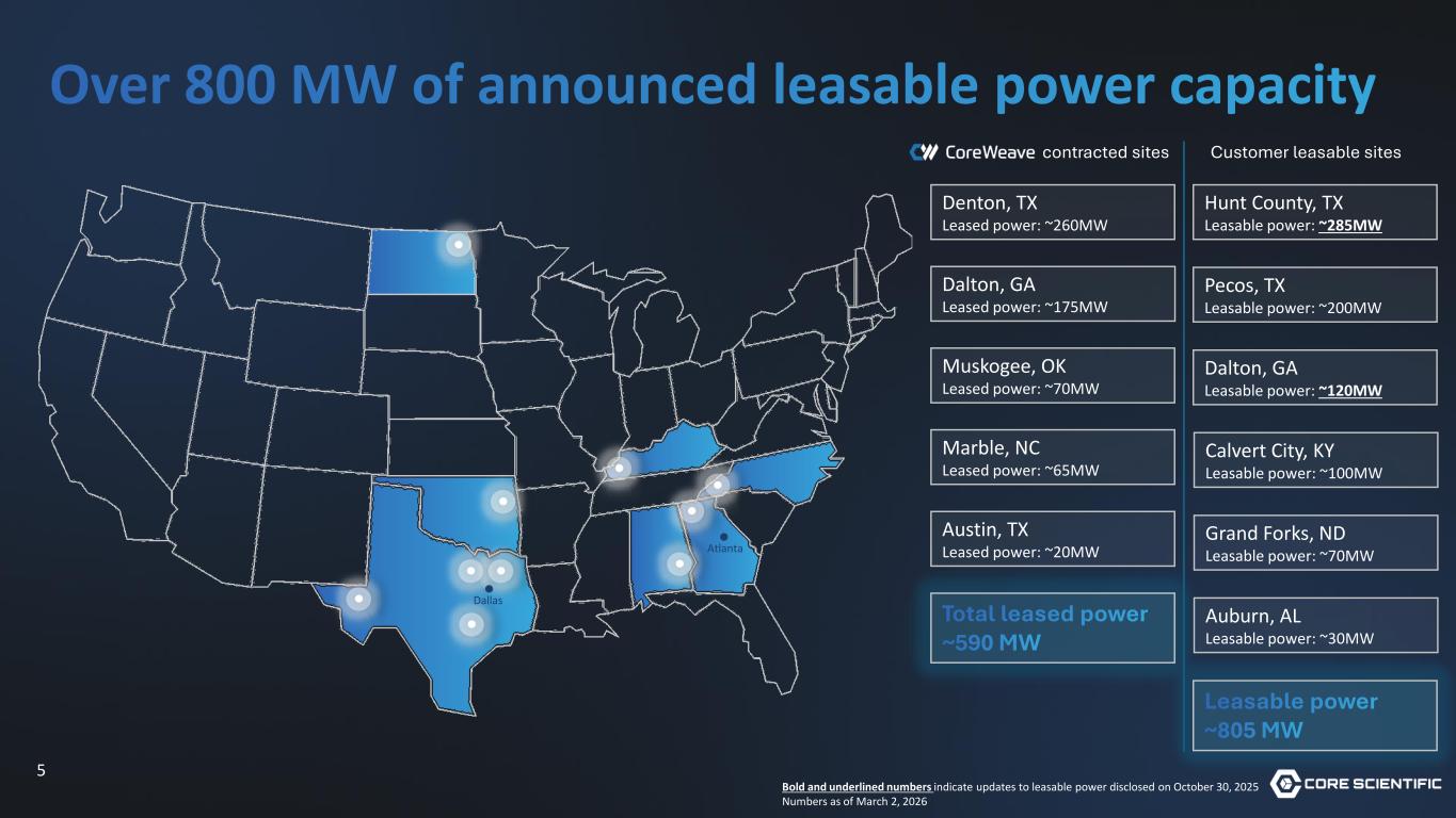 3 Core Scientific overview Core Scientific is a leader in digital infrastructure for high-density colocation services. We operate dedicated, purpose-built facilities for high-density colocation services and are a premier provider of digital infrastructure, software solutions and services to our third-party customers. By the end of 2028, we expect every megawatt in our portfolio to be dedicated to colocation to support artificial intelligence-related workloads and next generation colocation services. $8.6B FULLY DILUTED MARKET CAP* 7 STATES ~1.5 GW $10B+ IN LEASABLE POWER PIPELINE IN CONTRACTED REVENUE ACROSS OUR FOOTPRINT *Based on stock price as of February 27, 2026, close and fully diluted share count of ~506 million
