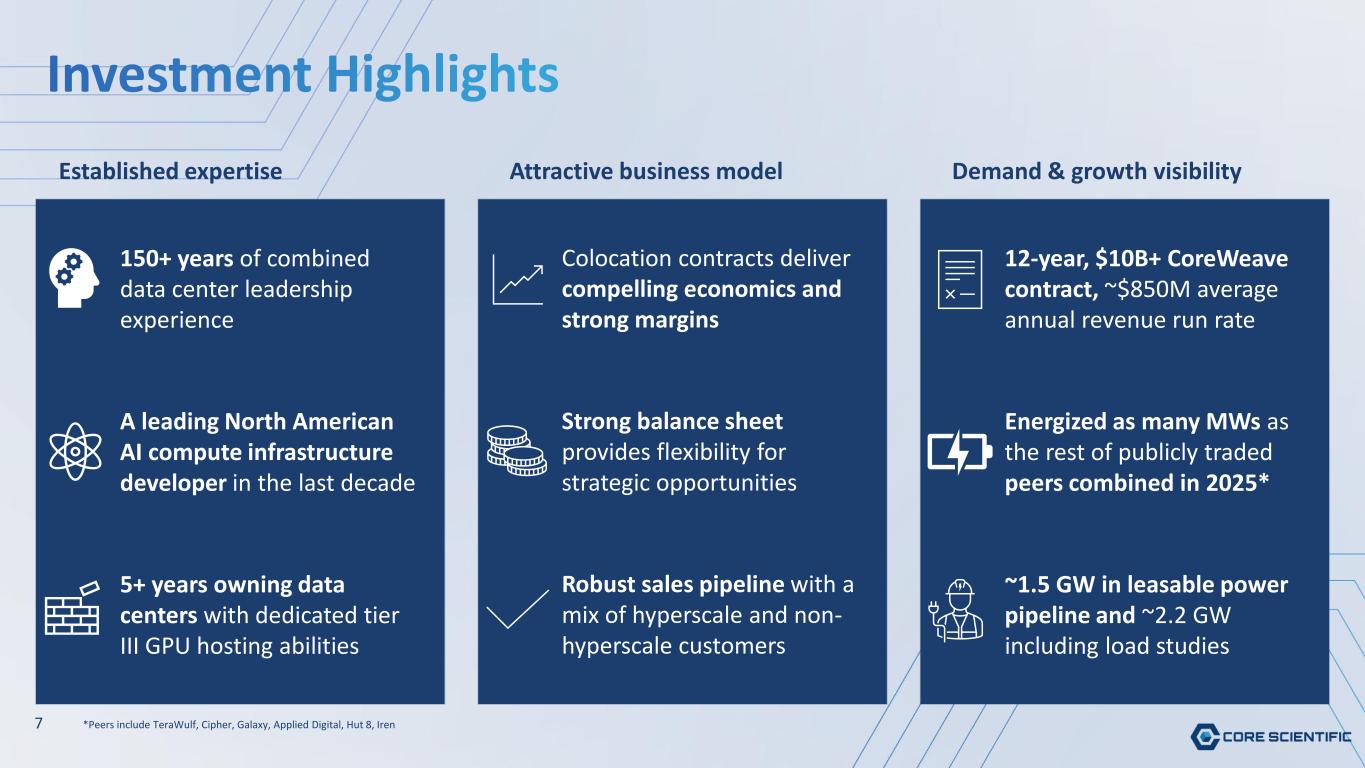 6 ~520 MW ~285 MW NEW HUNT COUNTY, TX LOCATION Total Leasable Power Pipeline* CURRENT LEASABLE CAPACITY AT EXISTING SITES ~1.5 GW Our current power pipeline has ~1.5 GW of customer leasable power potential *Does not include ~590 MW of already contracted power ~700 MW UNANNOUNCED LEASABLE CUSTOMER POWER OPPORTUNITIES TOTAL LEASABLE CUSTOMER POWER PIPELINE In addition to ~1.5 GW, the Company maintains an incremental ~700 MWs of capacity currently in active, targeted load studies across multiple markets