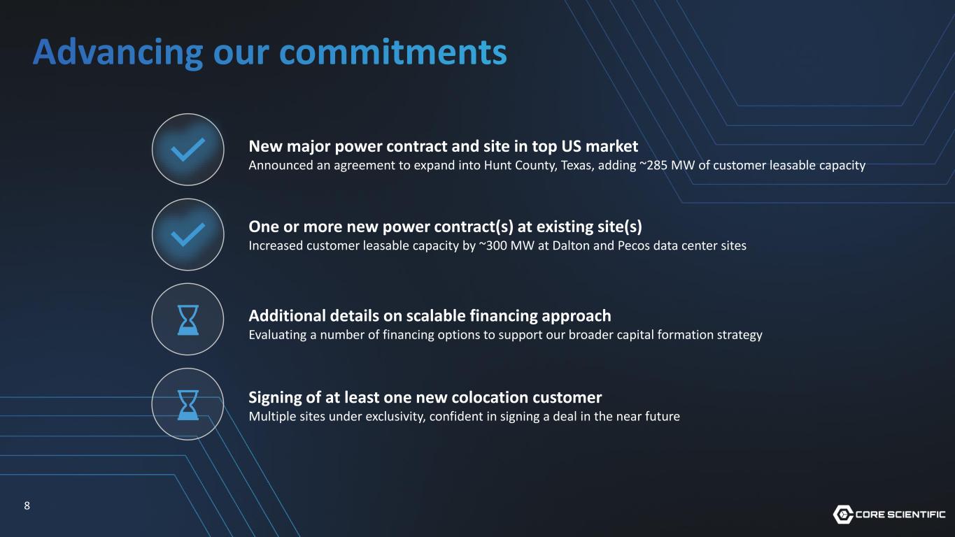 Investment Highlights Established expertise 150+ years of combined data center leadership experience Attractive business model Demand & growth visibility A leading North American AI compute infrastructure developer in the last decade 5+ years owning data centers with dedicated tier III GPU hosting abilities Colocation contracts deliver compelling economics and strong margins Strong balance sheet provides flexibility for strategic opportunities Robust sales pipeline with a mix of hyperscale and non- hyperscale customers 12-year, $10B+ CoreWeave contract, ~$850M average annual revenue run rate Energized as many MWs as the rest of publicly traded peers combined in 2025* ~1.5 GW in leasable power pipeline and ~2.2 GW including load studies 7 *Peers include TeraWulf, Cipher, Galaxy, Applied Digital, Hut 8, Iren