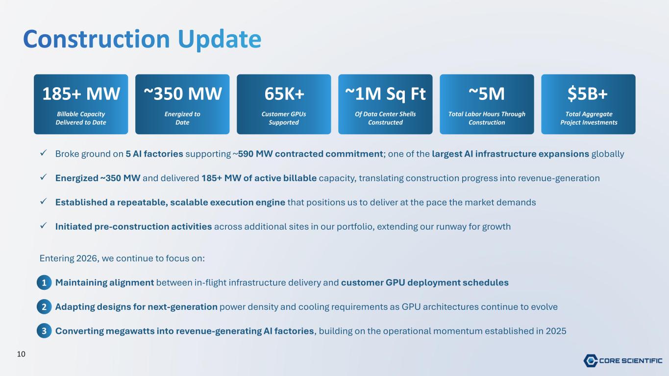 9 Expansion into Hunt County brings Texas footprint to ~485 MW* in leasable power capacity Pecos Austin Denton Hunt Agreement to acquire LLC owning ~265 acres ~430 MW of gross capacity ~285 MW of leasable customer power capacity Begin energization in 2027, ramping to full power by 2029 Power and ramp schedule approved through ERCOT interconnection process in October 2024 Dallas Hunt County Site Details *Also includes 200 MWs of leasable customer power at Pecos, Texas